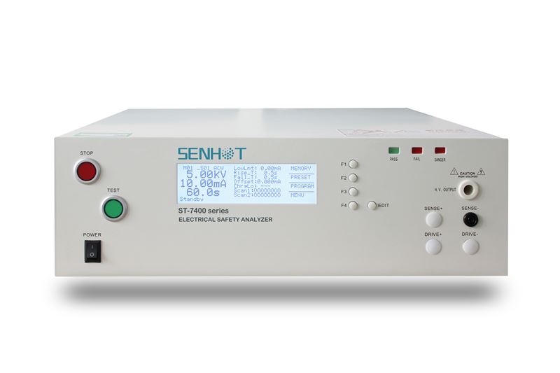 在产品的介电强度极限测试中,用户一般会设定一个比较高的电压,如用10KV或20KV超高压耐压仪输出高压,用来记录产品在绝缘崩溃时的耐压点。为帮助客户完成产品的绝缘极限崩溃的测试验证,我司推出了SENHOT ST-7471/ST-7472/ST-7473等10KV耐压测试仪机型,仪器具备交流耐压、直流耐压、绝缘阻抗多合一测试功能,可以设定仪器的高压爬升时间,用以记录绝缘崩溃的数据,且可依实际测试需求,在10KV耐压测试仪的三个机型中灵活自由选择合适机型。搭配我司的上位机软件,可以有效地进行测试数据的记录、分析、追溯等。